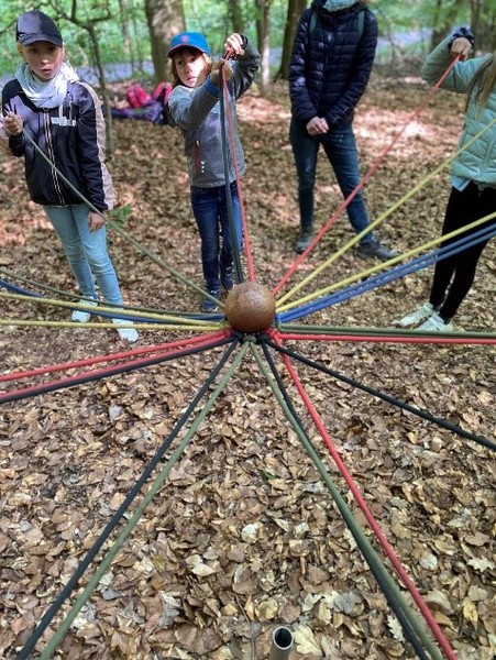 An allen Stationen stand aber nicht nur das Wissen im Vordergrund, sondern der Teamgeist. Gemeinsam schaffen wir das! Dies war auch der Fokus der Station „Erde im Gleichgewicht“. Alle Kinder hielten Teile des Ökosystems in ihren Händen, verdeutlicht durch bunte Bänder (grün=Pflanzen, blau=Wasserlebewesen etc.). In der Mitte lag die Erde als goldene Kugel. Alle halfen gemeinsam, die Erde im Gleichgewicht zu halten und sie nicht fallen zu lassen.