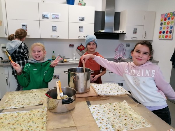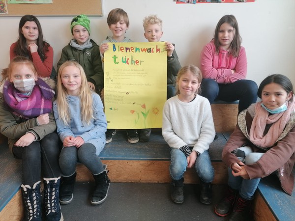 Das Thema „Mülltrennung“ und vor allem „Müllvermeidung“ ist fester Bestandteil in unserem Schulprogramm und unserem Schulalltag. Die Kinder der Umwelt AG befassten sich besonders intensiv mit dem Thema. Sie überlegten, wie man nachhaltige und umweltfreundliche Verpackungen herstellen könnte, um Plastik zu vermeiden. So entwickelte sich die Idee, aus Stoff Wachstücher herzustellen. Bienenwachs bekamen sie vom ortsansässigen Imker. In mühsamer Arbeit wurden die Stoffe geschnitten und mit Wachs eingepinselt. Der Förderverein verkaufte die Tücher auf dem Weihnachtsmarkt.